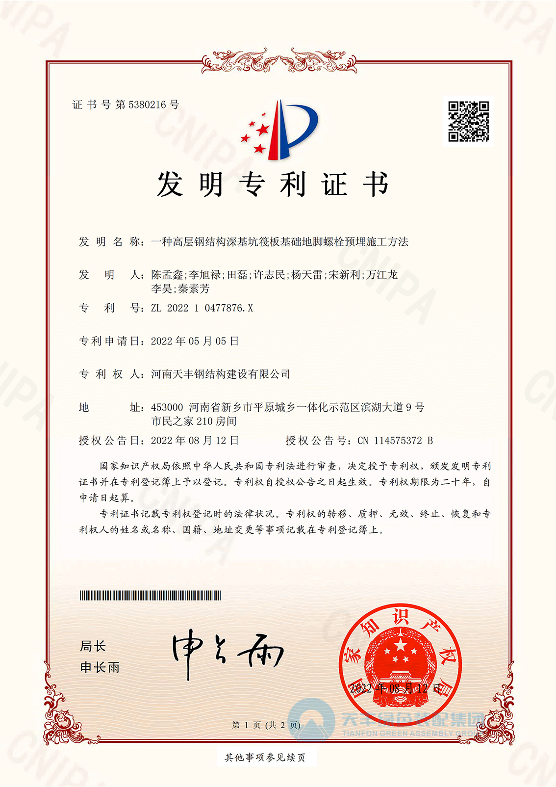 该专利利用新型预埋装置实现了地脚螺栓的装配式预埋安装,对促进钢结构建筑的标准化、工厂化加工,装配化施工具有重大推广价值。